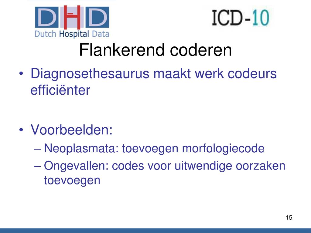 Flankerend coderen • Diagnosethesaurus maakt werk codeurs efficiënter • Voorbeelden: • Neoplasmata: toevoegen morfologiecode • Ongevallen: codes voor uitwendige oorzaken toevoegen