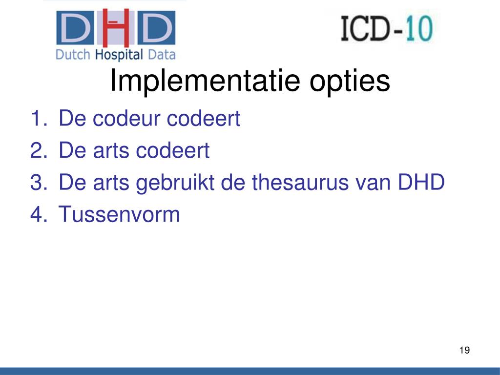 Implementatie opties • De codeurcodeert • De arts codeert • De arts gebruikt de thesaurus van DHD • Tussenvorm