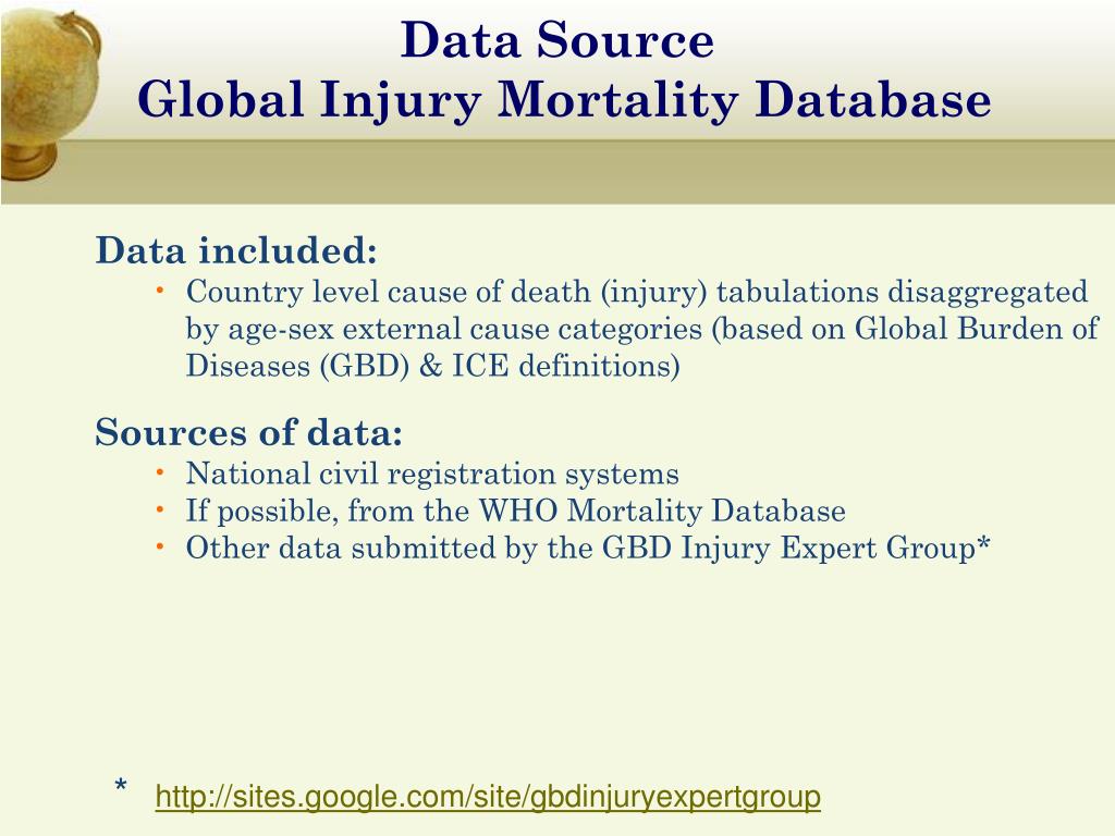 Data Source Global Injury Mortality Database Data included: • Country level cause of death (injury) tabulations disaggregated by age-sex external cause categories (based on Global Burden of Diseases (GBD) & ICE definitions) Sources of data: • National civil registration systems • If possible, from the WHO Mortality Database • Other data submitted by the GBD Injury Expert Group* • http://sites.google.com/site/gbdinjuryexpertgroup