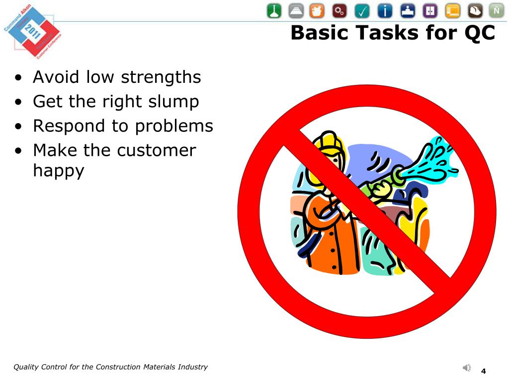 Basic Tasks for QC • Avoid low strengths • Get the right slump • Respond to problems • Make the customer happy Quality Control for the Construction Materials Industry