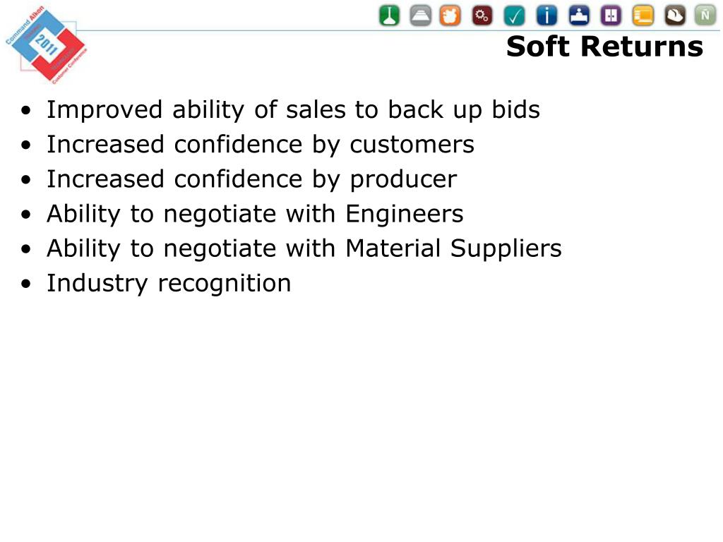 Soft Returns • Improved ability of sales to back up bids • Increased confidence by customers • Increased confidence by producer • Ability to negotiate with Engineers • Ability to negotiate with Material Suppliers • Industry recognition