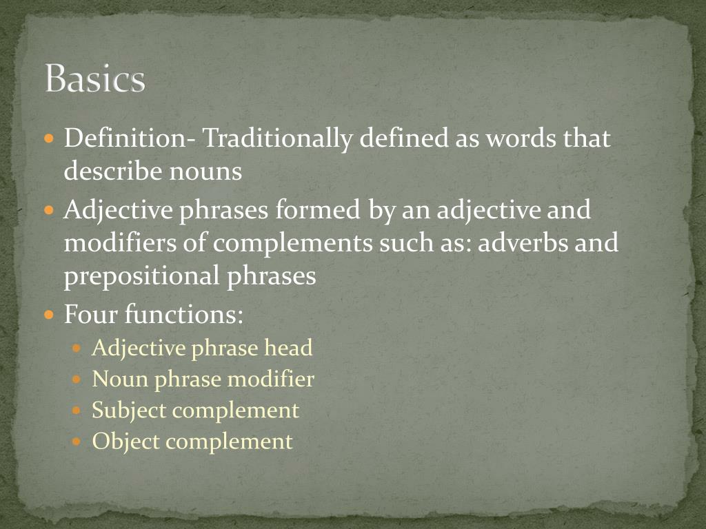 Basics • Definition- Traditionally defined as words that describe nouns • Adjective phrases formed by an adjective and modifiers of complements such as: adverbs and prepositional phrases • Four functions: • Adjective phrase head • Noun phrase modifier • Subject complement • Object complement