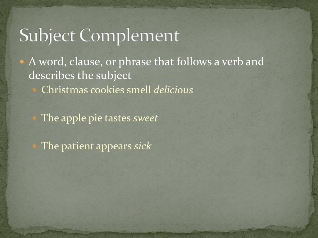 Subject Complement • A word, clause, or phrase that follows a verb and describes the subject • Christmas cookies smell delicious • The apple pie tastes sweet • The patient appears sick