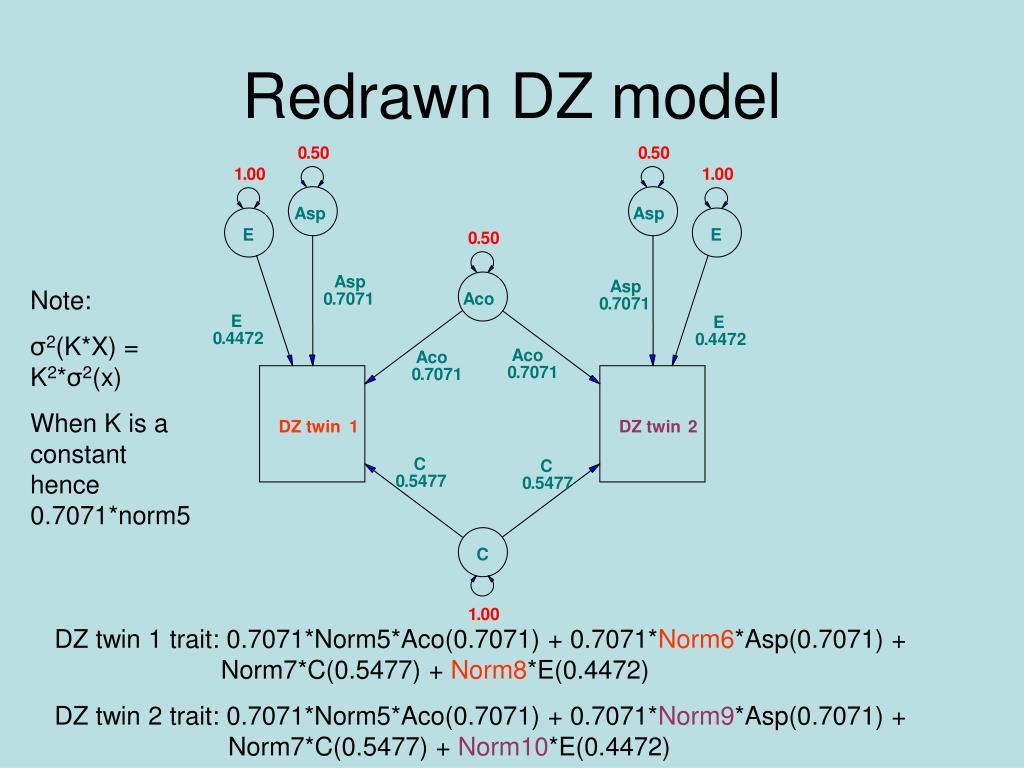 Redrawn DZ model 0 . 50 0 . 50 1 . 00 1 . 00 Asp Asp E E 0 . 50 Asp Asp Note: σ2(K*X) = K2*σ2(x) When K is a constant hence 0.7071*norm5 0 . 7071 Aco 0 . 7071 E E 0 . 4472 0 . 4472 Aco Aco 0 . 7071 0 . 7071 DZ twin 1 DZ twin 2 C C 0 . 5477 0 . 5477 C 1 . 00 DZ twin 1 trait: 0.7071*Norm5*Aco(0.7071) + 0.7071*Norm6*Asp(0.7071) + Norm7*C(0.5477) + Norm8*E(0.4472) DZ twin 2 trait: 0.7071*Norm5*Aco(0.7071) + 0.7071*Norm9*Asp(0.7071) + Norm7*C(0.5477) + Norm10*E(0.4472)