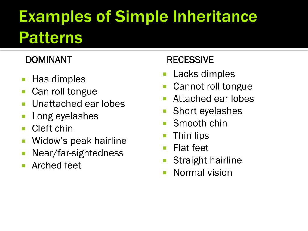 Recessive Examples of Simple Inheritance Patterns Dominant • Has dimples • Can roll tongue • Unattached ear lobes • Long eyelashes • Cleft chin • Widow’s peak hairline • Near/far-sightedness • Arched feet • Lacks dimples • Cannot roll tongue • Attached ear lobes • Short eyelashes • Smooth chin • Thin lips • Flat feet • Straight hairline • Normal vision
