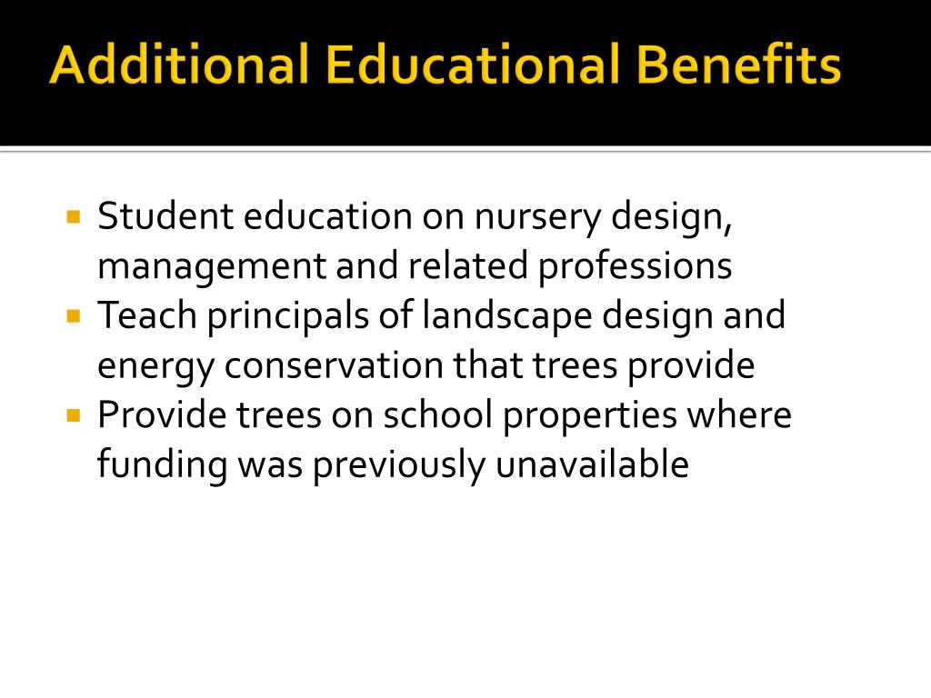 Additional Educational Benefits • Student education on nursery design, management and related professions • Teach principals of landscape design and energy conservation that trees provide • Provide trees on school properties where funding was previously unavailable