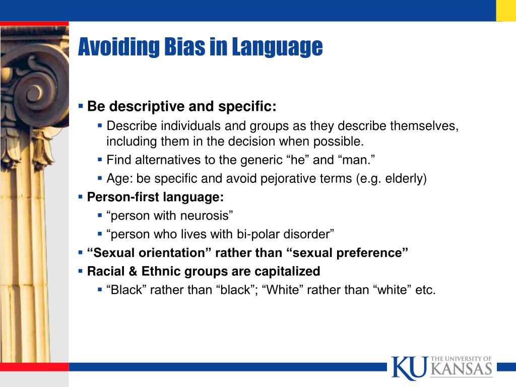 Avoiding Bias in Language • Be descriptive and specific: • Describe individuals and groups as they describe themselves, including them in the decision when possible. • Find alternatives to the generic “he” and “man.” • Age: be specific and avoid pejorative terms (e.g. elderly) • Person-first language: • “person with neurosis” • “person who lives with bi-polar disorder” • “Sexual orientation” rather than “sexual preference” • Racial & Ethnic groups are capitalized • “Black” rather than “black”; “White” rather than “white” etc.