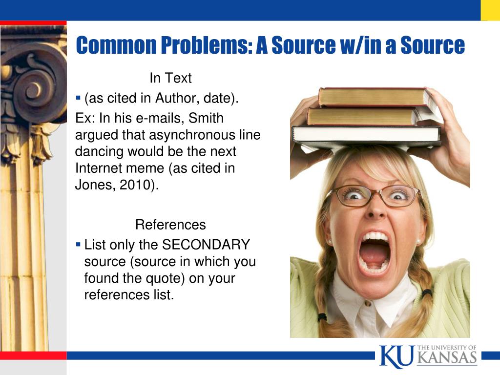Common Problems: A Source w/in a Source In Text • (as cited in Author, date). Ex: In his e-mails, Smith argued that asynchronous line dancing would be the next Internet meme (as cited in Jones, 2010). References • List only the SECONDARY source (source in which you found the quote) on your references list.