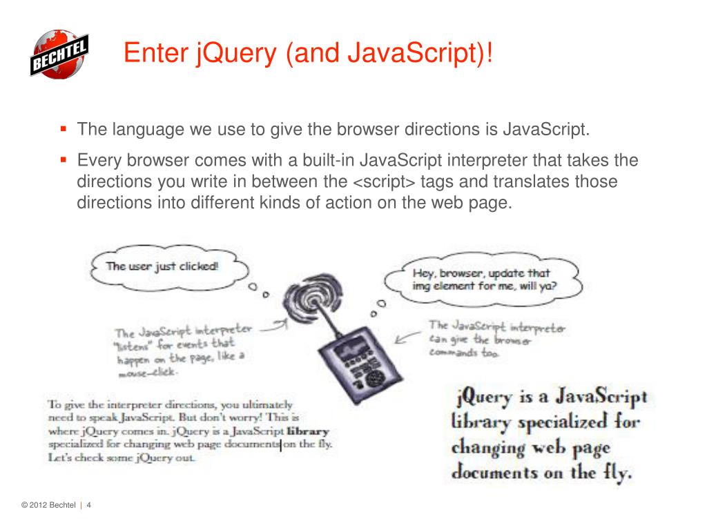 Enter jQuery (and JavaScript)! • The language we use to give the browser directions is JavaScript. • Every browser comes with a built-in JavaScript interpreter that takes the directions you write in between the <script> tags and translates those directions into different kinds of action on the web page.