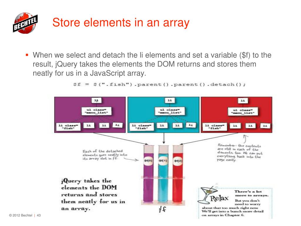 Store elements in an array • When we select and detach the li elements and set a variable ($f) to the result, jQuery takes the elements the DOM returns and stores them neatly for us in a JavaScript array.