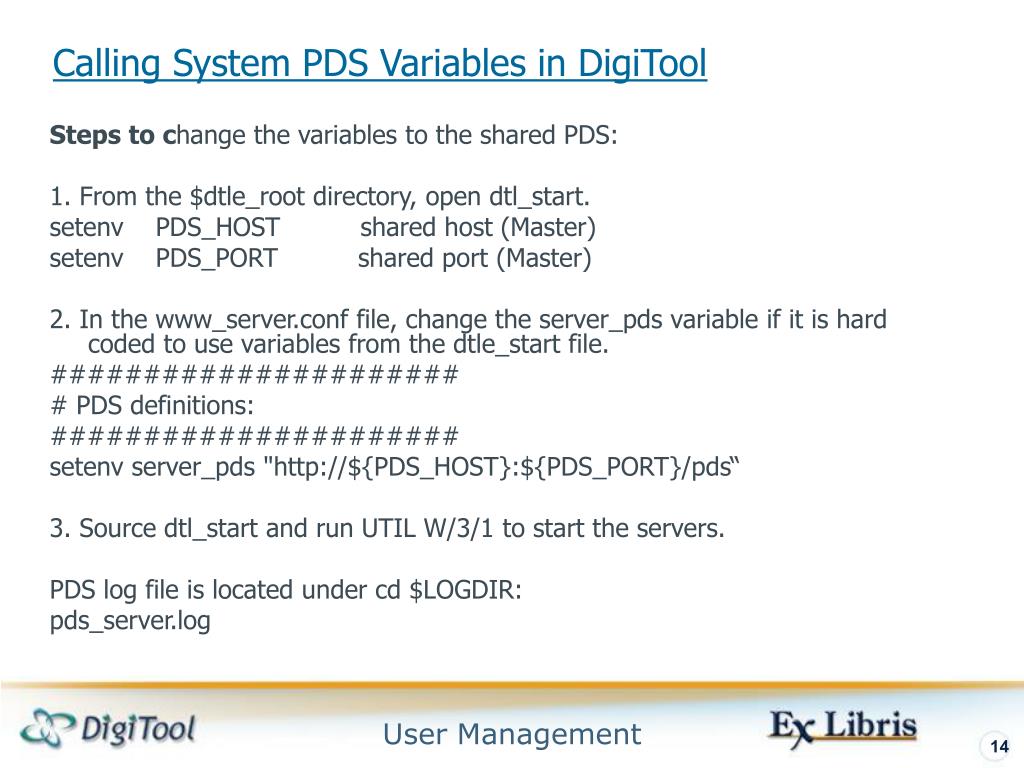 Calling System PDS Variables in DigiTool Steps to change the variables to the shared PDS: 1. From the $dtle_root directory, open dtl_start. setenv PDS_HOST shared host (Master) setenv PDS_PORT shared port (Master) 2. In the www_server.conf file, change the server_pds variable if it is hard coded to use variables from the dtle_start file. ###################### # PDS definitions: ###################### setenv server_pds "http://${PDS_HOST}:${PDS_PORT}/pds“ 3. Source dtl_start and run UTIL W/3/1 to start the servers. PDS log file is located under cd $LOGDIR: pds_server.log