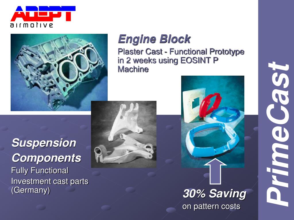 PrimeCast Engine Block Plaster Cast - Functional Prototype in 2 weeks using EOSINT P Machine Suspension Components Fully Functional Investment cast parts (Germany) 30% Saving on pattern costs
