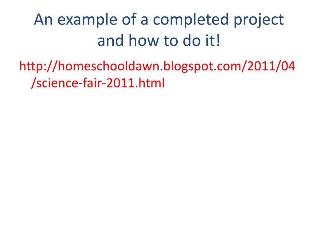 An example of a completed project and how to do it! http://homeschooldawn.blogspot.com/2011/04/science-fair-2011.html