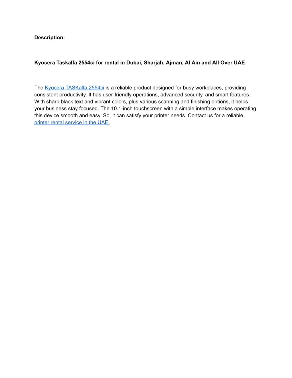 Description: Kyocera Taskalfa 2554ci for rental in Dubai, Sharjah, Ajman, Al Ain and All Over UAE The Kyocera TASKalfa 2554ci is a reliable product designed for busy workplaces, providing consistent productivity. It has user-friendly operations, advanced security, and smart features. With sharp black text and vibrant colors, plus various scanning and finishing options, it helps your business stay focused. The 10.1-inch touchscreen with a simple interface makes operating this device smooth and easy. So, it can satisfy your printer needs. Contact us for a reliable printer rental service in the UAE.