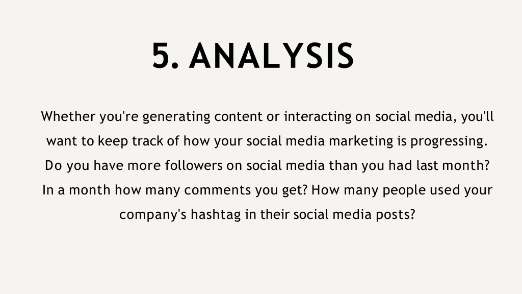 5.ANALYSIS Whetheryou'regeneratingcontentorinteractingonsocialmedia,you'll wanttokeeptrackofhowyoursocialmediamarketingisprogressing. Doyouhavemorefollowersonsocialmediathanyouhadlastmonth? Inamonthhowmanycommentsyouget?Howmanypeopleusedyour company'shashtagintheirsocialmediaposts?