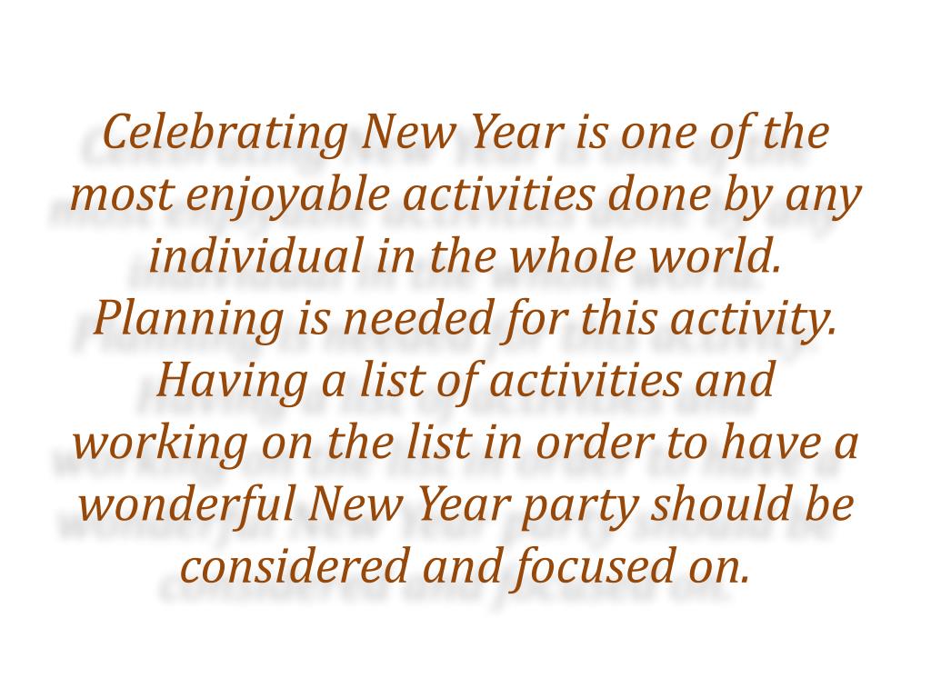 Celebrating New Year is one of the most enjoyable activities done by any individual in the whole world. Planning is needed for this activity. Having a list of activities and working on the list in order to have a wonderful New Year party should be considered and focused on.