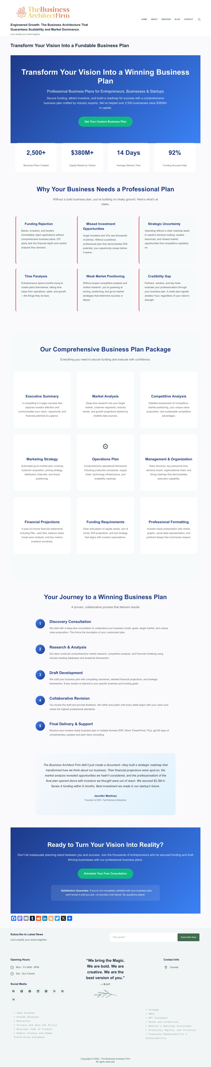 HOME ABOUT SERVICES BLOG CONTACT Engineered Growth: The Business Architecture That Guarantees Scalability and Market Dominance. Let’s amplify your brand together. Transform Your Vision Into a Fundable Business Plan Transform Your Vision Into a Winning Business Plan Professional Business Plans for Entrepreneurs, Businesses & Startups Secure funding, attract investors, and build a roadmap for success with a comprehensive business plan crafted by industry experts. We’ve helped over 2,500 businesses raise $380M+ in capital. Get Your Custom Business Plan 2,500+ $380M+ 14 Days 92% Business Plans Created Capital Raised by Clients Average Delivery Time Funding Success Rate Why Your Business Needs a Professional Plan Without a solid business plan, you’re building on shaky ground. Here’s what’s at stake. ? Funding Rejection ? Missed Investment Opportunities ? Strategic Uncertainty Banks, investors, and lenders Operating without a clear roadmap leads immediately reject applications without to reactive decision-making, wasted Angel investors and VCs see thousands comprehensive business plans. DIY resources, and missed market of pitches. Without a polished, plans lack the financial depth and market opportunities that competitors capitalize professional plan that demonstrates ROI analysis they demand. on. potential, your opportunity closes before it opens. ? Time Paralysis ? Weak Market Positioning ? Credibility Gap Entrepreneurs spend months trying to Without proper competitive analysis and Partners, vendors, and key hires create plans themselves, taking time market research, you’re guessing at evaluate your professionalism through away from operations, sales, and growth pricing, positioning, and go-to-market your business plan. A weak plan signals —the things they do best. strategies that determine success or amateur hour, regardless of your vision’s failure. strength. Our Comprehensive Business Plan Package Everything you need to secure funding and execute with confidence. ? ? ? Executive Summary Market Analysis Competitive Analysis A compelling 2-3 page overview that Deep-dive research into your target Detailed assessment of competitors, captures investor attention and market, customer segments, industry market positioning, your unique value communicates your vision, opportunity, and trends, and growth projections backed by proposition, and sustainable competitive financial potential at a glance. credible data sources. advantages. ⚙ ? ? Marketing Strategy Operations Plan Management & Organization Actionable go-to-market plan covering Comprehensive operational framework Team structure, key personnel bios, customer acquisition, pricing strategy, including production processes, supply advisory board, organizational chart, and distribution channels, and brand chain, technology infrastructure, and hiring roadmap that demonstrates positioning. scalability roadmap. execution capability. ? ? ? Financial Projections Funding Requirements Professional Formatting 5-year pro forma financial statements Clear articulation of capital needs, use of Investor-ready presentation with charts, including P&L, cash flow, balance sheet, funds, ROI projections, and exit strategy graphs, visual data representation, and break-even analysis, and key metrics that aligns with investor expectations. polished design that commands respect. investors scrutinize. Your Journey to a Winning Business Plan A proven, collaborative process that delivers results Discovery Consultation 1 We start with a deep-dive consultation to understand your business model, goals, target market, and unique value proposition. This forms the foundation of your customized plan. Research & Analysis 2 Our team conducts comprehensive market research, competitive analysis, and financial modeling using industry-leading databases and analytical frameworks. Draft Development 3 We craft your business plan with compelling narratives, detailed financial projections, and strategic frameworks. Every section is tailored to your specific business and funding goals. Collaborative Revision 4 You review the draft and provide feedback. We refine and polish until every detail aligns with your vision and meets the highest professional standards. Final Delivery & Support 5 Receive your investor-ready business plan in multiple formats (PDF, Word, PowerPoint). Plus, get 90 days of complimentary updates and pitch deck consulting. The Business Architect Firm didn’t just create a document—they built a strategic roadmap that transformed how we think about our business. Their financial projections were spot-on, the market analysis revealed opportunities we hadn’t considered, and the professionalism of the final plan opened doors with investors we thought were out of reach. We secured $2.3M in Series A funding within 6 months. Best investment we made in our startup’s future. Jennifer Martinez Founder & CEO, TechVenture Solutions Ready to Turn Your Vision Into Reality? Don’t let inadequate planning stand between you and success. Join the thousands of entrepreneurs who’ve secured funding and built thriving businesses with our professional business plans. Schedule Your Free Consultation ? Satisfaction Guarantee: If you’re not completely satisfied with your business plan, we’ll revise it until you are—or provide a full refund. No questions asked. Subscribe to Latest News Your email * Subscribe Now Let’s amplify your brand together. Opening Hours Contact Info “We bring the Magic. We are bold. We are creative. We are the best version of you.” Mon - Fri 9AM - 8PM Canada Sat - Sun Closed Social Media — B.A.F. > Sitemap > DMCA > FTC Statement > Terms and Conditions > Results & Earnings Disclaimer > Diversity, Equity, and Inclusion > Corporate Responsibility & Sustainability > Case Studies > Brands Showcase > Resources > Privacy and Data Use Policy > Business Code of Conduct > Modern Slavery and Human Trafficking Statement Copyright © 2026 - The Busin