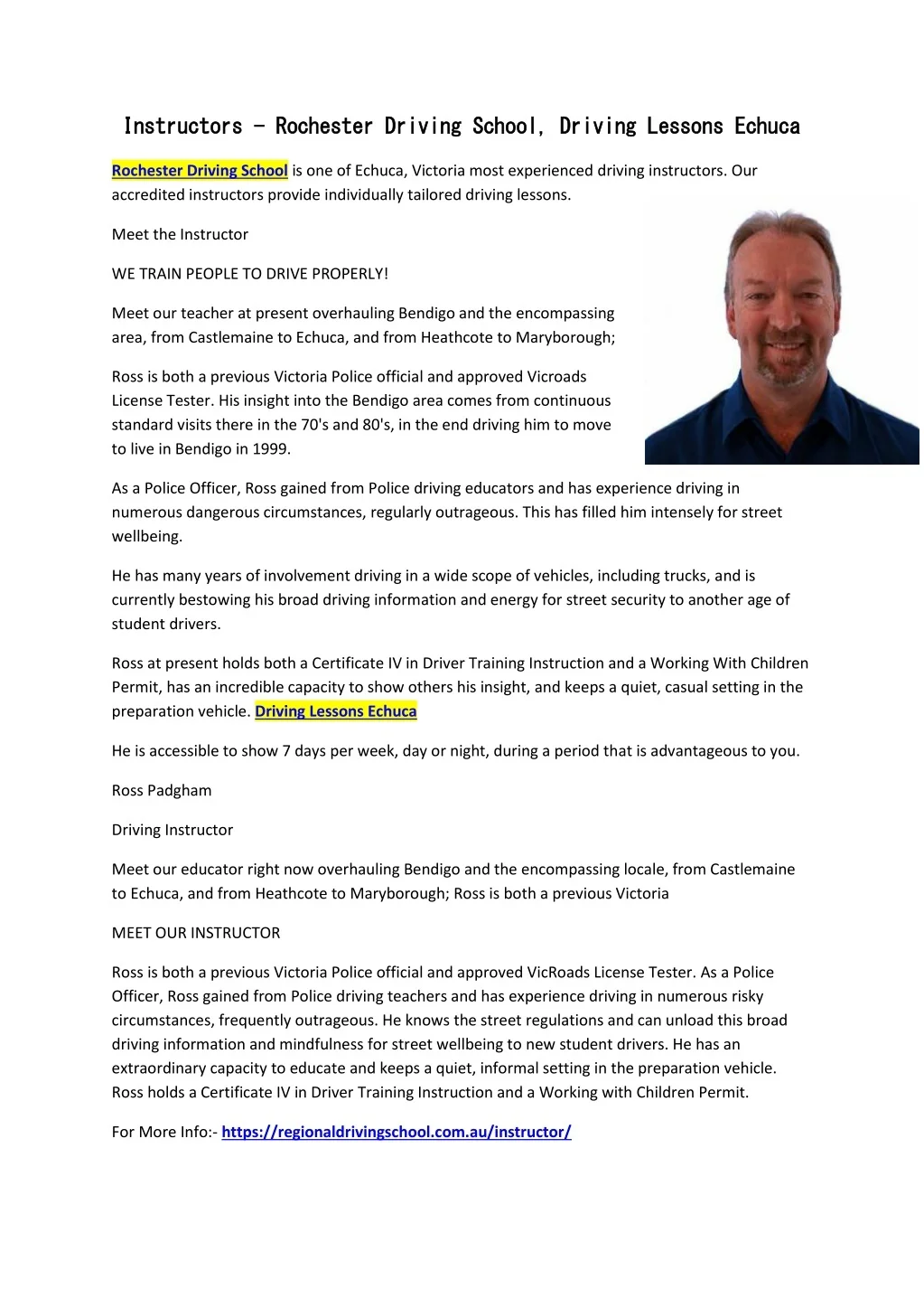 I In ns st tr ru uc ct to or rs s - - R Ro oc ch he es st te er r D Dr ri iv vi in ng g S Sc ch ho oo ol l, , D Dr ri iv vi in ng g L Le es ss so on ns s E Ec ch hu uc ca a Rochester Driving School is one of Echuca, Victoria most experienced driving instructors. Our accredited instructors provide individually tailored driving lessons. Meet the Instructor WE TRAIN PEOPLE TO DRIVE PROPERLY! Meet our teacher at present overhauling Bendigo and the encompassing area, from Castlemaine to Echuca, and from Heathcote to Maryborough; Ross is both a previous Victoria Police official and approved Vicroads License Tester. His insight into the Bendigo area comes from continuous standard visits there in the 70's and 80's, in the end driving him to move to live in Bendigo in 1999. As a Police Officer, Ross gained from Police driving educators and has experience driving in numerous dangerous circumstances, regularly outrageous. This has filled him intensely for street wellbeing. He has many years of involvement driving in a wide scope of vehicles, including trucks, and is currently bestowing his broad driving information and energy for street security to another age of student drivers. Ross at present holds both a Certificate IV in Driver Training Instruction and a Working With Children Permit, has an incredible capacity to show others his insight, and keeps a quiet, casual setting in the preparation vehicle. Driving Lessons Echuca He is accessible to show 7 days per week, day or night, during a period that is advantageous to you. Ross Padgham Driving Instructor Meet our educator right now overhauling Bendigo and the encompassing locale, from Castlemaine to Echuca, and from Heathcote to Maryborough; Ross is both a previous Victoria MEET OUR INSTRUCTOR Ross is both a previous Victoria Police official and approved VicRoads License Tester. As a Police Officer, Ross gained from Police driving teachers and has experience driving in numerous risky circumstances, frequently outrageous. He knows the street regulations and can unload this broad driving information and mindfulness for street wellbeing to new student drivers. He has an extraordinary capacity to educate and keeps a quiet, informal setting in the preparation vehicle. Ross holds a Certificate IV in Driver Training Instruction and a Working with Children Permit. For More Info:- https://regionaldrivingschool.com.au/instructor/