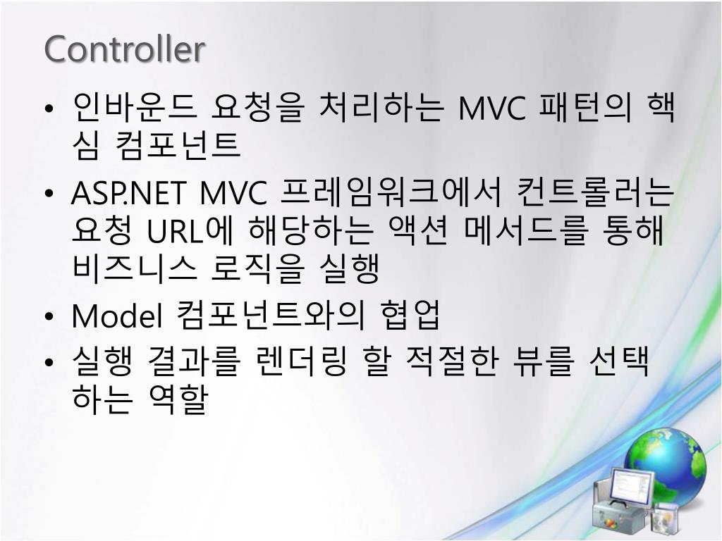 Controller • 인바운드 요청을 처리하는 MVC 패턴의 핵심 컴포넌트 • ASP.NET MVC 프레임워크에서 컨트롤러는 요청 URL에 해당하는 액션 메서드를 통해 비즈니스 로직을 실행 • Model 컴포넌트와의 협업 • 실행 결과를 렌더링 할 적절한 뷰를 선택하는 역할