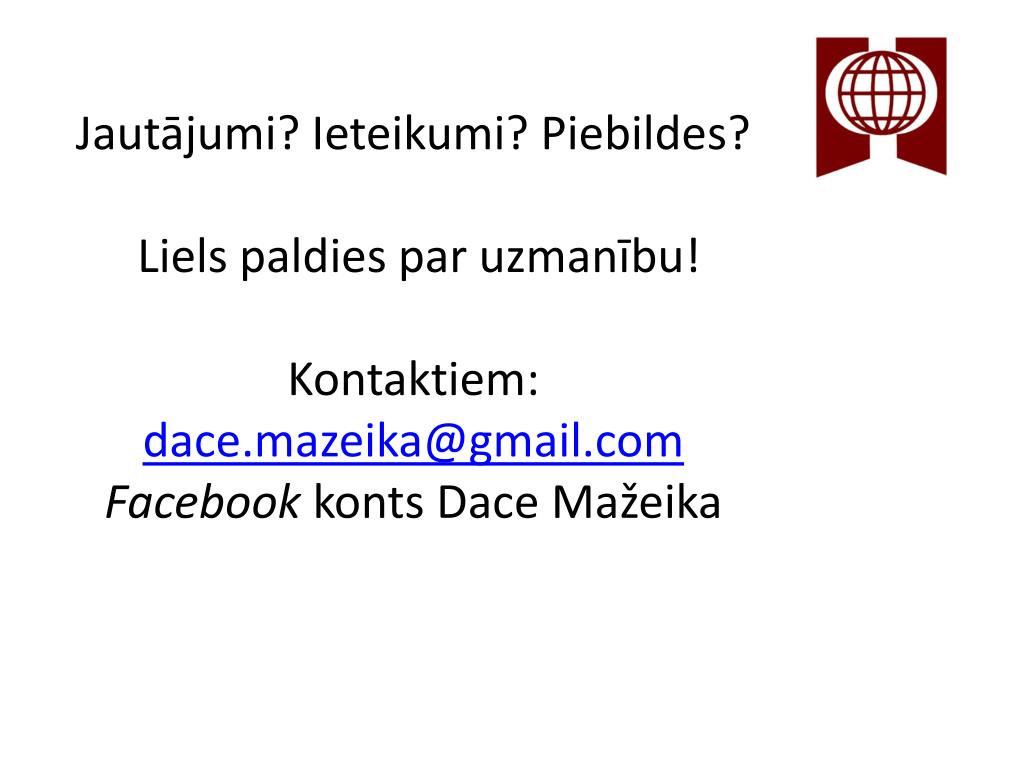 Jautājumi? Ieteikumi? Piebildes? Liels paldies par uzmanību! Kontaktiem:dace.mazeika@gmail.comFacebook konts Dace Mažeika
