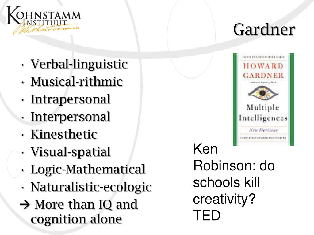 Gardner • Verbal-linguistic • Musical-rithmic • Intrapersonal • Interpersonal • Kinesthetic • Visual-spatial • Logic-Mathematical • Naturalistic-ecologic More than IQ and cognitionalone Ken Robinson: do schools killcreativity? TED
