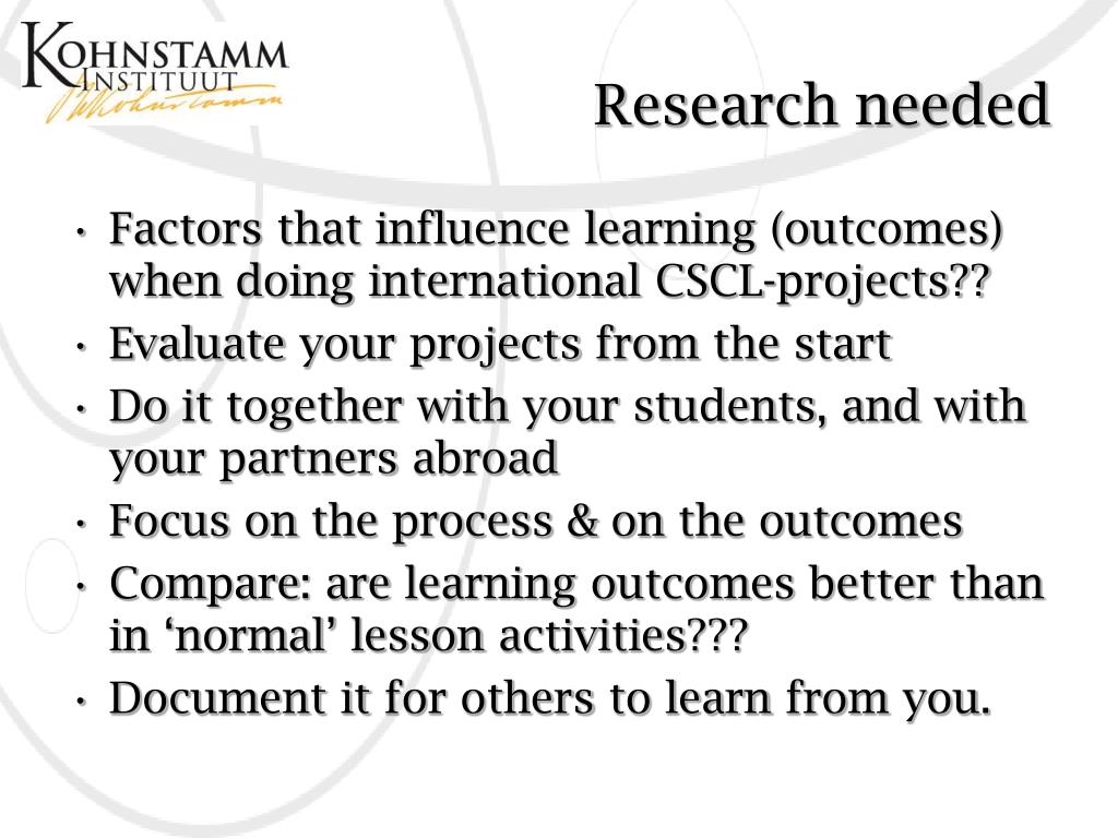 Research needed • Factors that influence learning (outcomes) when doing international CSCL-projects?? • Evaluateyourprojectsfrom the start • Do ittogetherwithyourstudents, and withyour partners abroad • Focus on the process & on the outcomes • Compare: are learningoutcomesbetterthan in ‘normal’ lessonactivities??? • Document itforothers to learnfromyou.