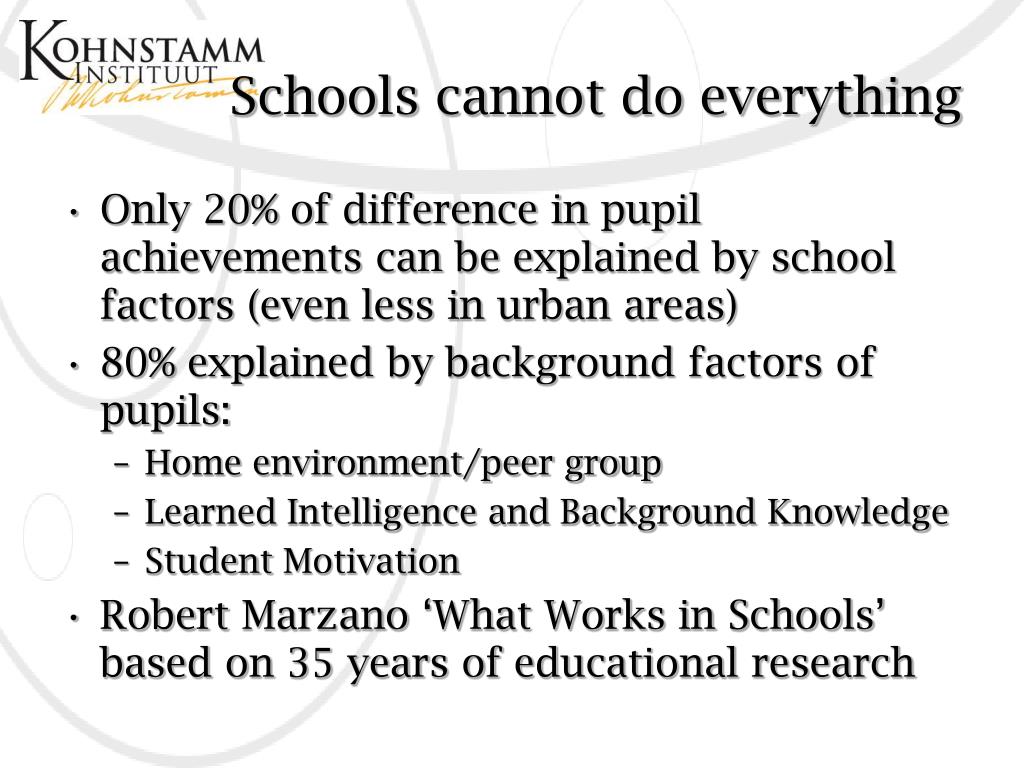 Schools cannot do everything • Only 20% of difference in pupil achievements can be explained by school factors (even less in urban areas) • 80% explained by background factors of pupils: • Home environment/peer group • Learned Intelligence and Background Knowledge • Student Motivation • Robert Marzano ‘What Works in Schools’ based on 35 years of educational research