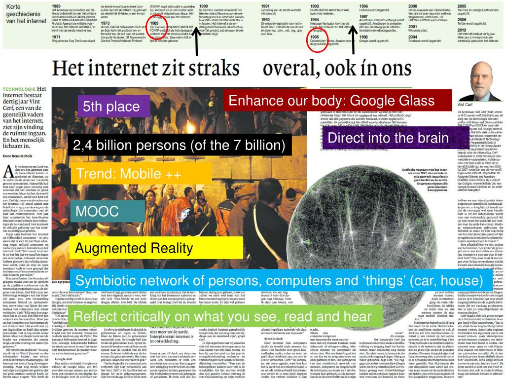 Enhanceour body: Google Glass 5th place Direct into the brain 2,4 billionpersons (of the 7 billion) Trend: Mobile ++ MOOC AugmentedReality Symbioticnetwork of persons, computers and ‘things’ (car, house) Reflectcriticallyonwhatyousee, read and hear