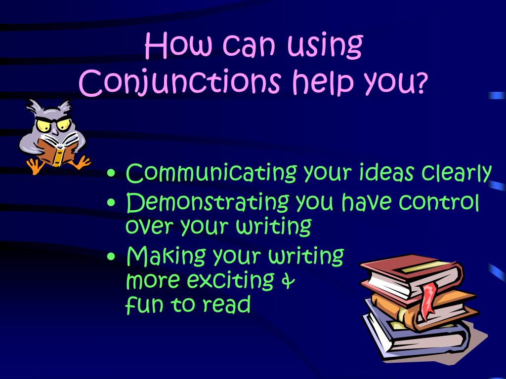 How can using Conjunctions help you? • Communicating your ideas clearly • Demonstrating you have controlover your writing • Making your writing more exciting &fun to read