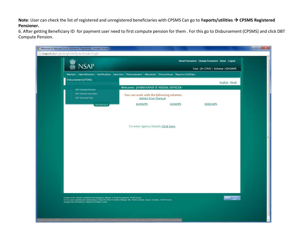 Note: User can check the list of registered and unregistered beneficiaries with CPSMS Can go to Reports/utilities CPSMS Registered Pensioner.6. After getting Beneficiary ID for payment user need to first compute pension for them . For this go to Disbursement (CPSMS) and click DBT Compute Pension.