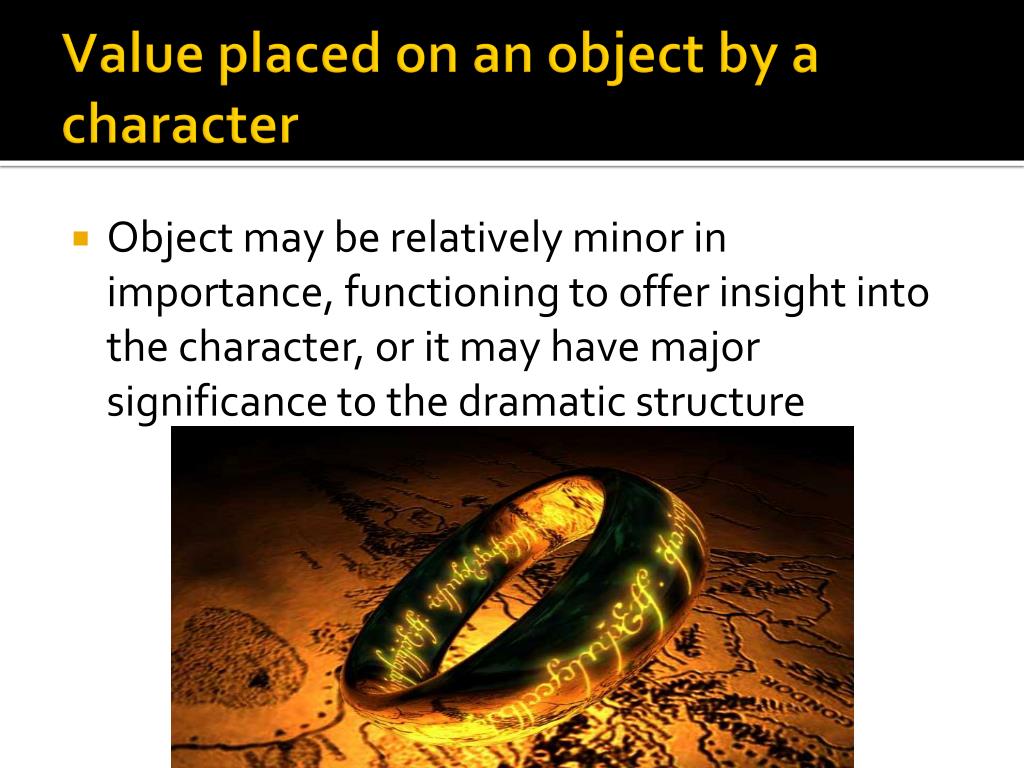 Value placed on an object by a character • Object may be relatively minor in importance, functioning to offer insight into the character, or it may have major significance to the dramatic structure