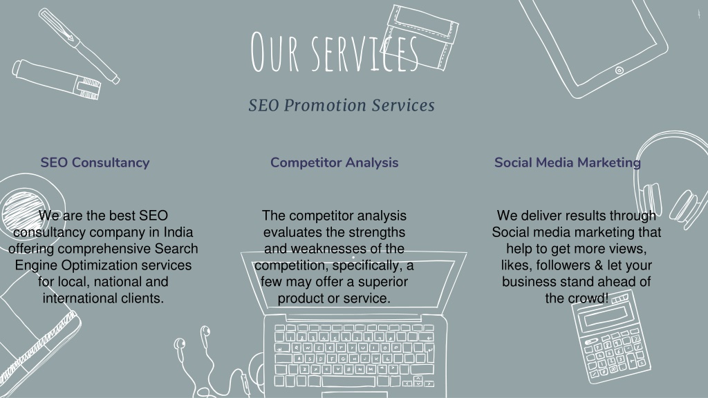 Our services SEO Consultancy Competitor Analysis Social Media Marketing SEO Promotion Services We deliver results through Social media marketing that help to get more views, likes, followers & let your business stand ahead of the crowd! The competitor analysis evaluates the strengths and weaknesses of the competition, specifically, a few may offer a superior product or service. We are the best SEO consultancy company in India offering comprehensive Search Engine Optimization services for local, national and international clients.