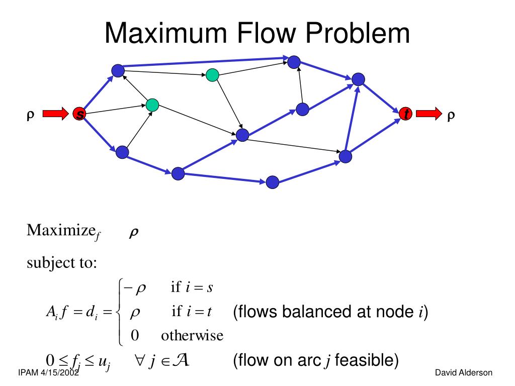 s t subject to: (flows balanced at nodei) 0 fj uj j A(flow on arcj feasible) Maximum Flow Problem Maximizef David Alderson