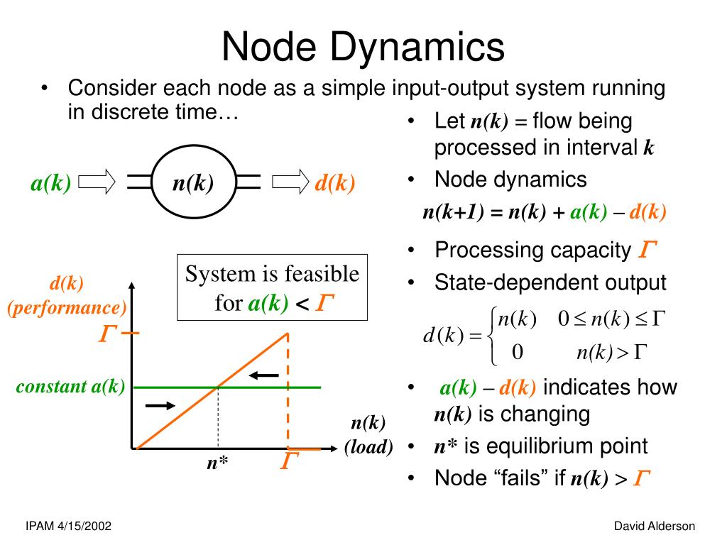 n(k) a(k) d(k) • Processing capacity • State-dependent output d(k) (performance) constant a(k) • a(k) – d(k) indicates how n(k) is changing • n* is equilibrium point • Node “fails” ifn(k) > n(k) (load) n* Node Dynamics • Consider each node as a simple input-output system running in discrete time… • Letn(k) = flow being processed in intervalk • Node dynamics • n(k+1) = n(k) + a(k) – d(k) System is feasible for a(k)< David Alderson