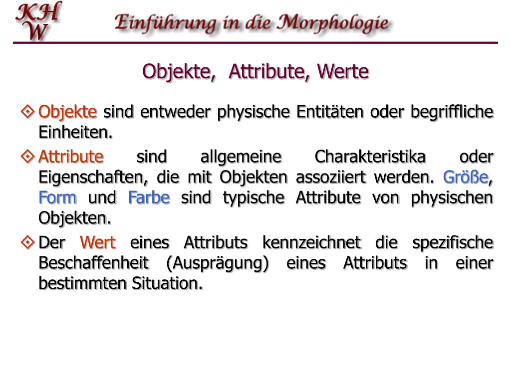 Objekte, Attribute, Werte • Objekte sind entweder physische Entitäten oder begriffliche Einheiten. • Attribute sind allgemeine Charakteristika oder Eigenschaften, die mit Objekten assoziiert werden. Größe, Form und Farbe sind typische Attribute von physischen Objekten. • Der Wert eines Attributs kennzeichnet die spezifische Beschaffenheit (Ausprägung) eines Attributs in einer bestimmten Situation.