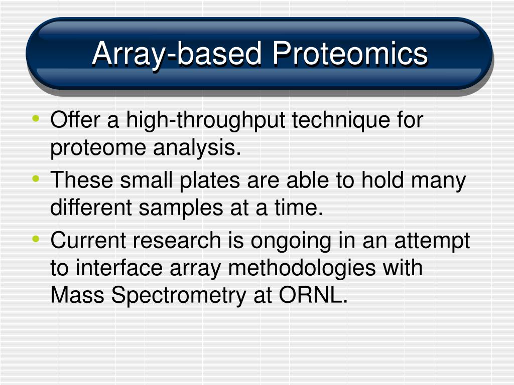 Array-based Proteomics • Offer a high-throughput technique for proteome analysis. • These small plates are able to hold many different samples at a time. • Current research is ongoing in an attempt to interface array methodologies with Mass Spectrometry at ORNL.