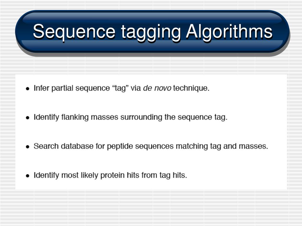 Algorithmic approaches to “tag” identification • Peptide sequence tags (Mann): extract and unambiguous sequence tag for ID. • Cross Correlation (Eng et al. - SEQUEST): comparison between observed and theoretically generated spectra. • Probability-based matching (Perkins, and the proprietary Mascot by Matrix Science): takes into statistical significance of fragmentation. • Which one of these approaches would you employ? (Hint: Discussion fostering question.) • Could DP be employed in the searching for post-translational modifications in future designs? • Could it be done in advance in order to factor account for PTMs to speed up the time of the search?