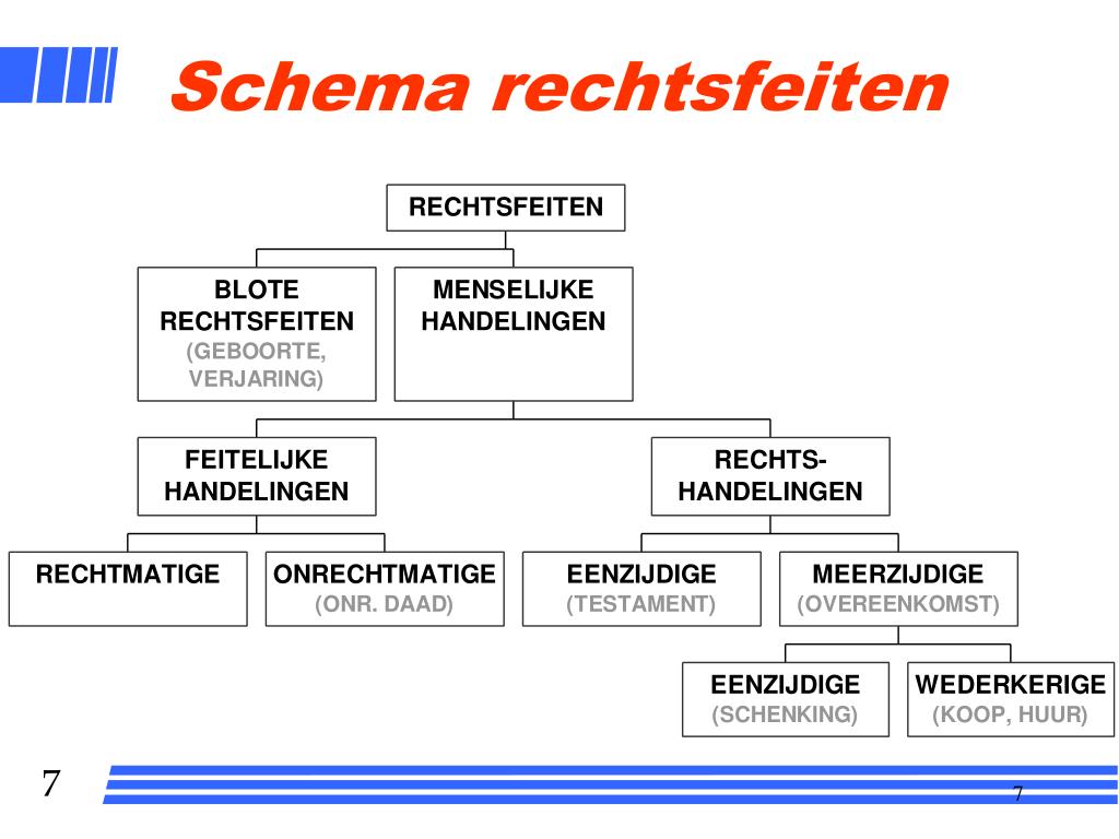 Rechtsfeiten • Rechtsfeiten zijn alle rechtens relevante feiten. • Door een rechtsfeit verandert er iets in de wereld van het recht: er ontstaat een subjectief recht wat er eerst niet was, er gaat een subjectief recht te niet of er ontstaat een verplichting. • Door een rechtsfeit “daalt het objectieve recht op aarde neer” en wordt het objectieve recht vertaald naar subjectieve rechten. • Rechtshandeling is een rechtsfeit met beoogd rechtsgevolg
