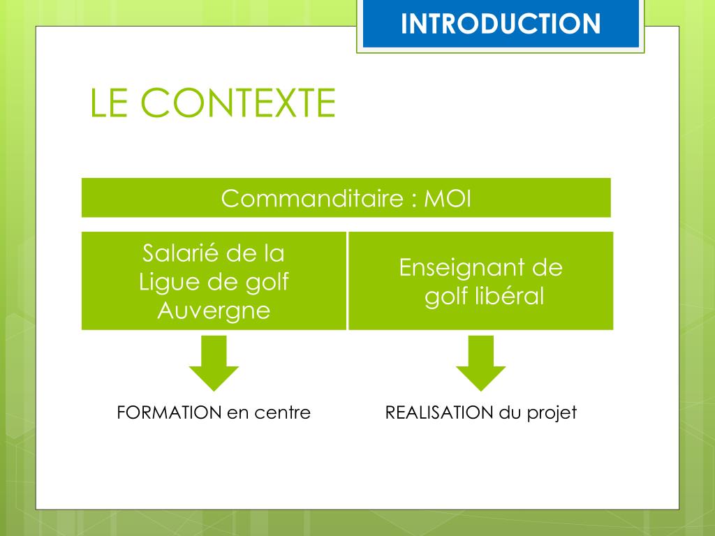 INTRODUCTION LE CONTEXTE Commanditaire : MOI Enseignant de golf libéral Salarié de la Ligue de golf Auvergne FORMATION en centre REALISATION du projet