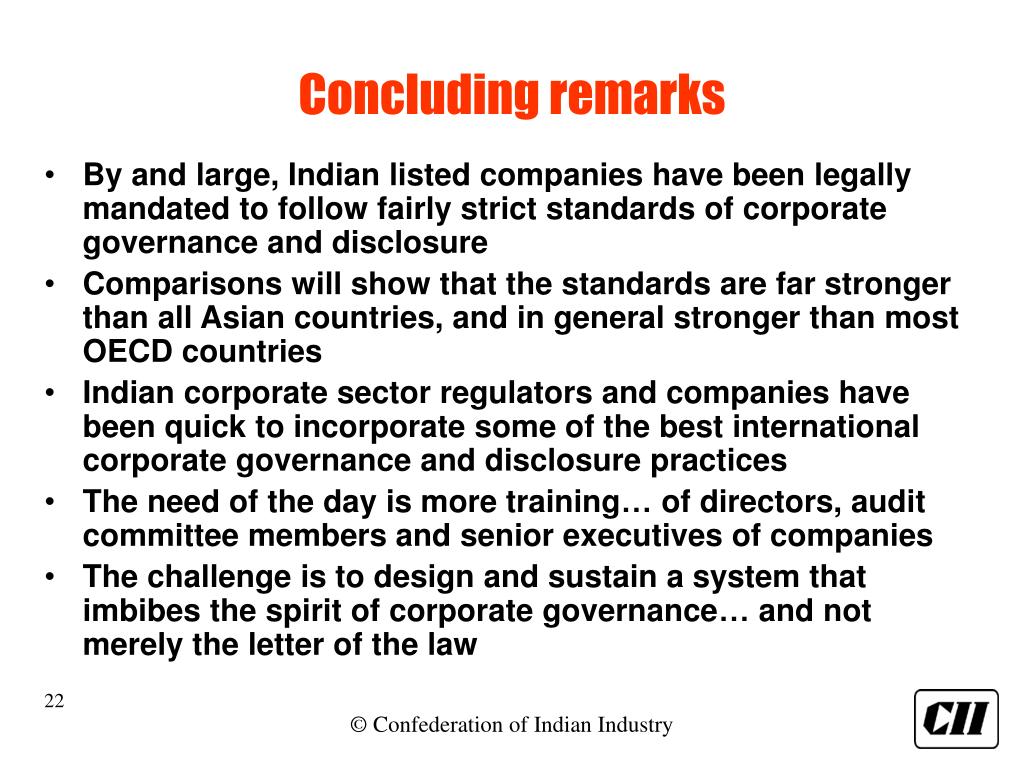 Concluding remarks • By and large, Indian listed companies have been legally mandated to follow fairly strict standards of corporate governance and disclosure • Comparisons will show that the standards are far stronger than all Asian countries, and in general stronger than most OECD countries • Indian corporate sector regulators and companies have been quick to incorporate some of the best international corporate governance and disclosure practices • The need of the day is more training… of directors, audit committee members and senior executives of companies • The challenge is to design and sustain a system that imbibes the spirit of corporate governance… and not merely the letter of the law