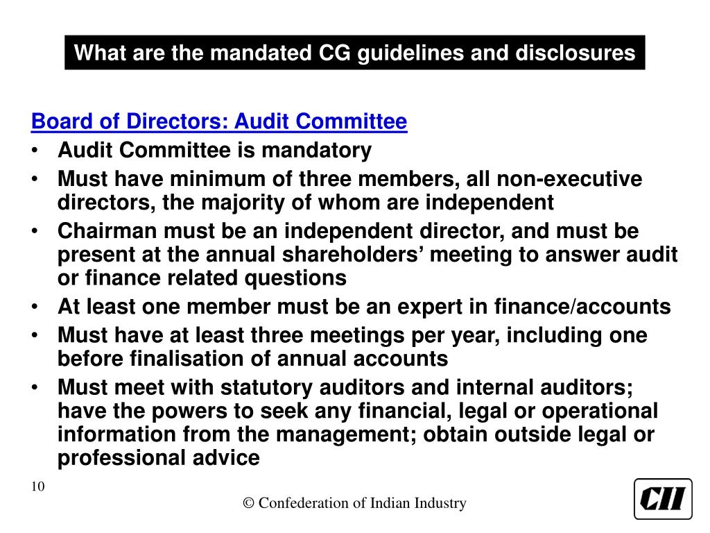 What are the mandated CG guidelines and disclosures Board of Directors: Audit Committee • Audit Committee is mandatory • Must have minimum of three members, all non-executive directors, the majority of whom are independent • Chairman must be an independent director, and must be present at the annual shareholders’ meeting to answer audit or finance related questions • At least one member must be an expert in finance/accounts • Must have at least three meetings per year, including one before finalisation of annual accounts • Must meet with statutory auditors and internal auditors; have the powers to seek any financial, legal or operational information from the management; obtain outside legal or professional advice
