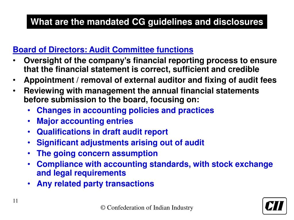 What are the mandated CG guidelines and disclosures Board of Directors: Audit Committee functions • Oversight of the company’s financial reporting process to ensure that the financial statement is correct, sufficient and credible • Appointment / removal of external auditor and fixing of audit fees • Reviewing with management the annual financial statements before submission to the board, focusing on: • Changes in accounting policies and practices • Major accounting entries • Qualifications in draft audit report • Significant adjustments arising out of audit • The going concern assumption • Compliance with accounting standards, with stock exchange and legal requirements • Any related party transactions