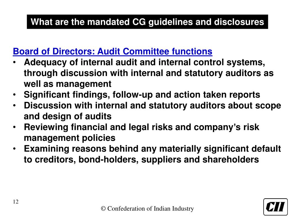What are the mandated CG guidelines and disclosures Board of Directors: Audit Committee functions • Adequacy of internal audit and internal control systems, through discussion with internal and statutory auditors as well as management • Significant findings, follow-up and action taken reports • Discussion with internal and statutory auditors about scope and design of audits • Reviewing financial and legal risks and company’s risk management policies • Examining reasons behind any materially significant default to creditors, bond-holders, suppliers and shareholders