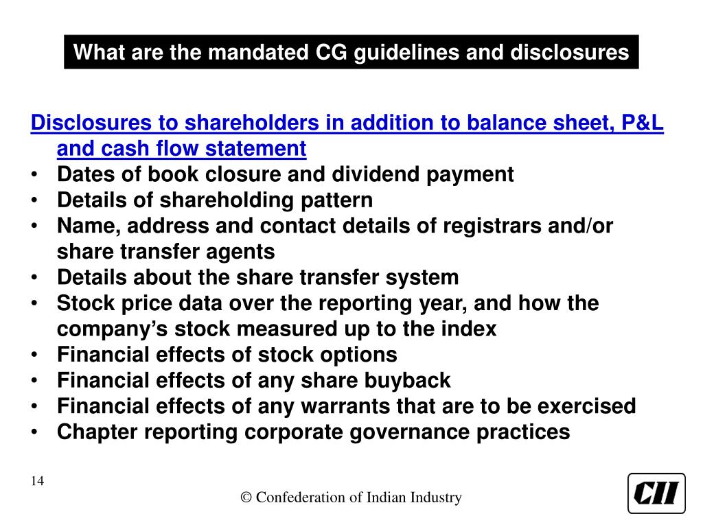 What are the mandated CG guidelines and disclosures Disclosures to shareholders in addition to balance sheet, P&L and cash flow statement • Dates of book closure and dividend payment • Details of shareholding pattern • Name, address and contact details of registrars and/or share transfer agents • Details about the share transfer system • Stock price data over the reporting year, and how the company’s stock measured up to the index • Financial effects of stock options • Financial effects of any share buyback • Financial effects of any warrants that are to be exercised • Chapter reporting corporate governance practices
