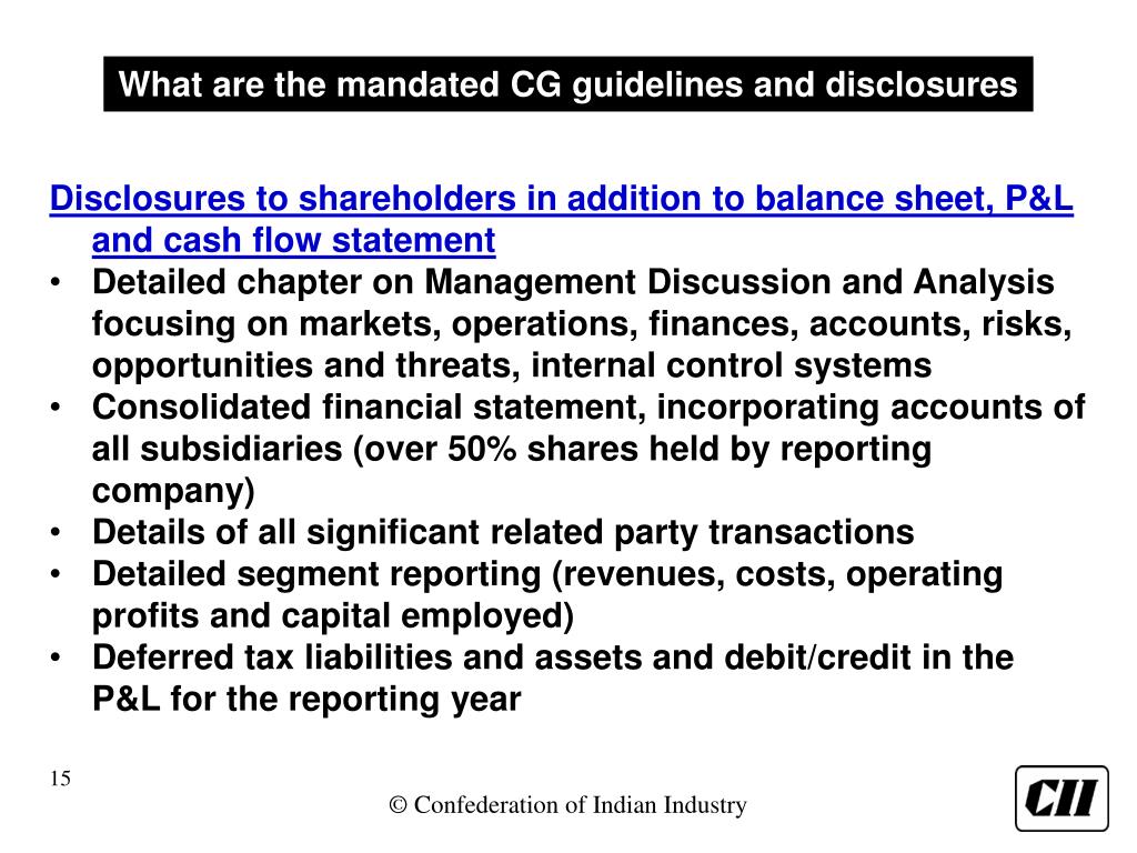 What are the mandated CG guidelines and disclosures Disclosures to shareholders in addition to balance sheet, P&L and cash flow statement • Detailed chapter on Management Discussion and Analysis focusing on markets, operations, finances, accounts, risks, opportunities and threats, internal control systems • Consolidated financial statement, incorporating accounts of all subsidiaries (over 50% shares held by reporting company) • Details of all significant related party transactions • Detailed segment reporting (revenues, costs, operating profits and capital employed) • Deferred tax liabilities and assets and debit/credit in the P&L for the reporting year