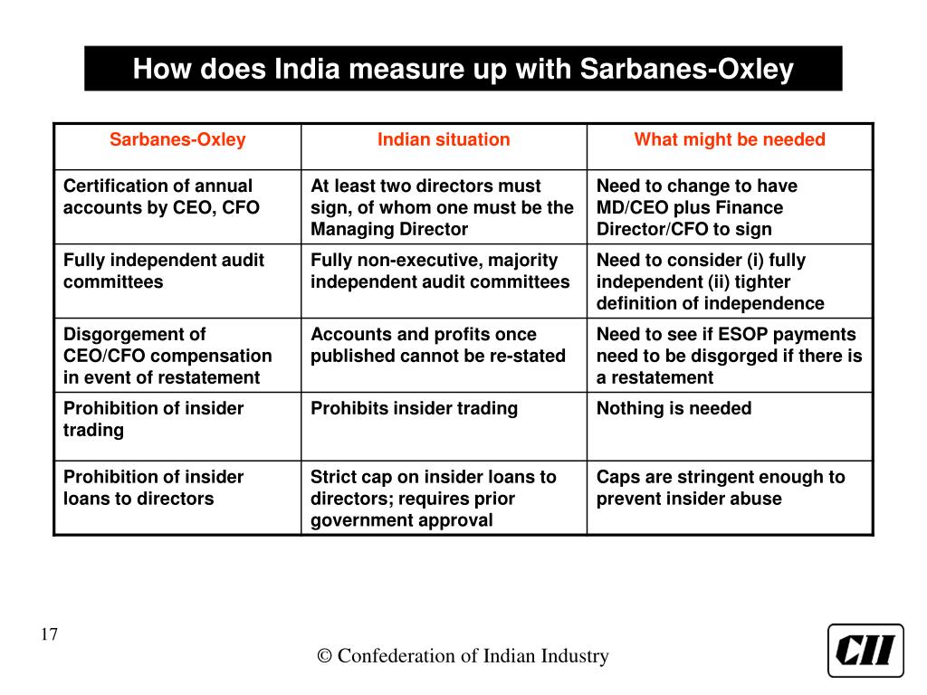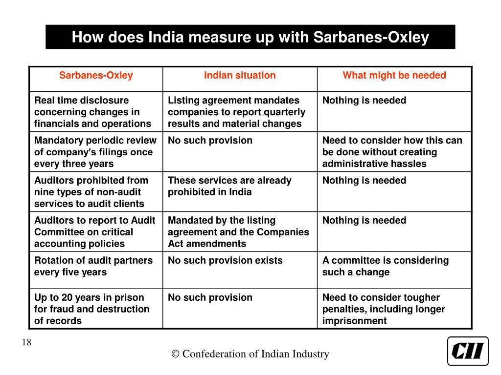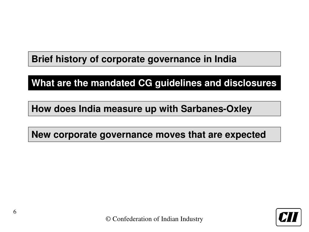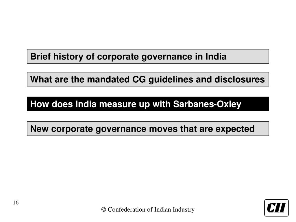 Brief history of corporate governance in India What are the mandated CG guidelines and disclosures How does India measure up with Sarbanes-Oxley New corporate governance moves that are expected