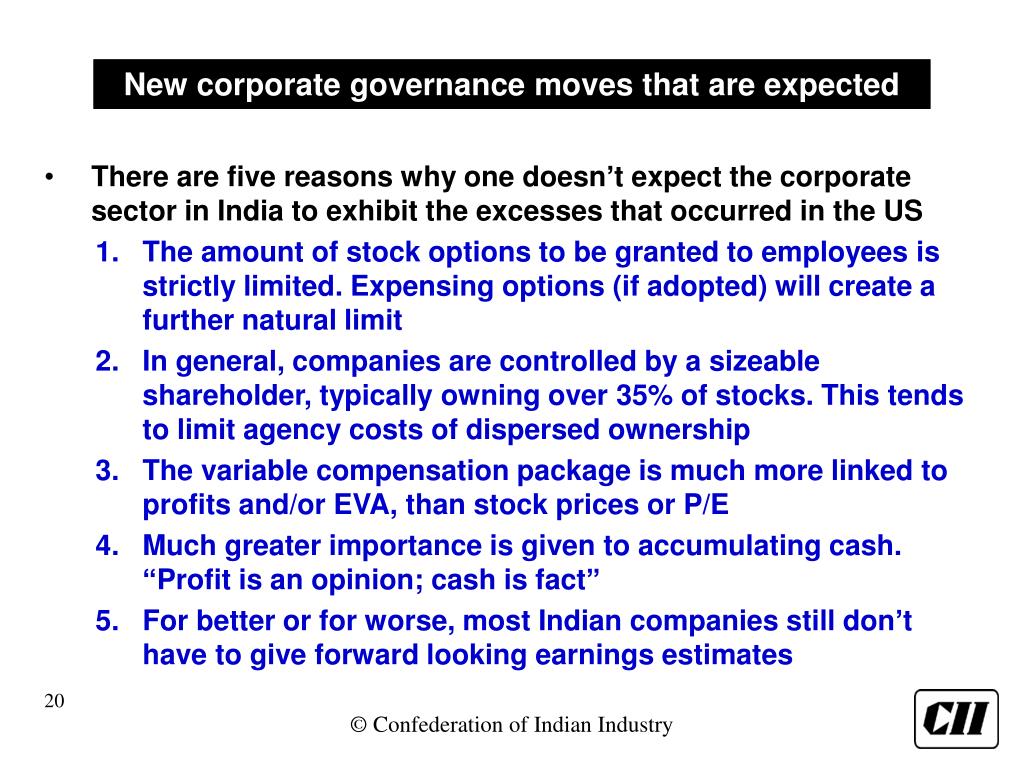 New corporate governance moves that are expected • There are five reasons why one doesn’t expect the corporate sector in India to exhibit the excesses that occurred in the US • The amount of stock options to be granted to employees is strictly limited. Expensing options (if adopted) will create a further natural limit • In general, companies are controlled by a sizeable shareholder, typically owning over 35% of stocks. This tends to limit agency costs of dispersed ownership • The variable compensation package is much more linked to profits and/or EVA, than stock prices or P/E • Much greater importance is given to accumulating cash. “Profit is an opinion; cash is fact” • For better or for worse, most Indian companies still don’t have to give forward looking earnings estimates