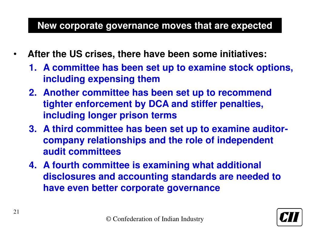 New corporate governance moves that are expected • After the US crises, there have been some initiatives: • A committee has been set up to examine stock options, including expensing them • Another committee has been set up to recommend tighter enforcement by DCA and stiffer penalties, including longer prison terms • A third committee has been set up to examine auditor-company relationships and the role of independent audit committees • A fourth committee is examining what additional disclosures and accounting standards are needed to have even better corporate governance