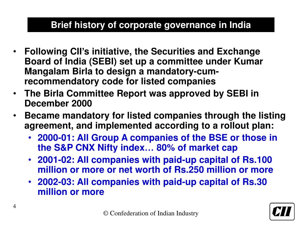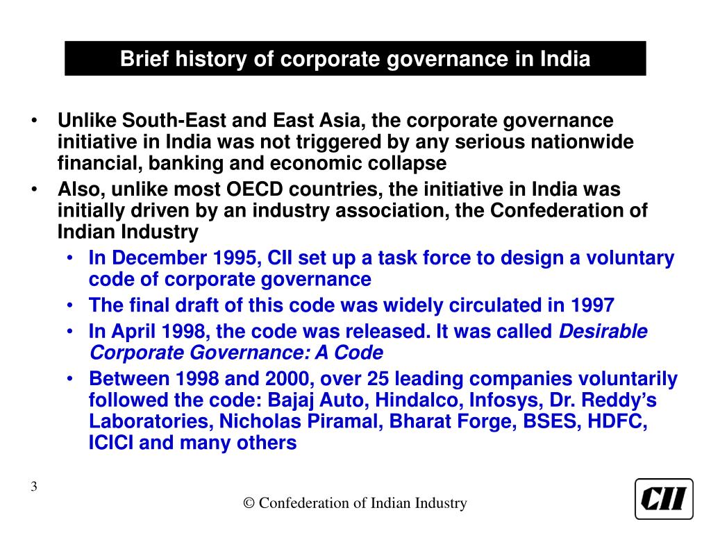 Brief history of corporate governance in India • Unlike South-East and East Asia, the corporate governance initiative in India was not triggered by any serious nationwide financial, banking and economic collapse • Also, unlike most OECD countries, the initiative in India was initially driven by an industry association, the Confederation of Indian Industry • In December 1995, CII set up a task force to design a voluntary code of corporate governance • The final draft of this code was widely circulated in 1997 • In April 1998, the code was released. It was called Desirable Corporate Governance: A Code • Between 1998 and 2000, over 25 leading companies voluntarily followed the code: Bajaj Auto, Hindalco, Infosys, Dr. Reddy’s Laboratories, Nicholas Piramal, Bharat Forge, BSES, HDFC, ICICI and many others