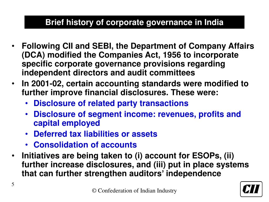 Brief history of corporate governance in India • Following CII and SEBI, the Department of Company Affairs (DCA) modified the Companies Act, 1956 to incorporate specific corporate governance provisions regarding independent directors and audit committees • In 2001-02, certain accounting standards were modified to further improve financial disclosures. These were: • Disclosure of related party transactions • Disclosure of segment income: revenues, profits and capital employed • Deferred tax liabilities or assets • Consolidation of accounts • Initiatives are being taken to (i) account for ESOPs, (ii) further increase disclosures, and (iii) put in place systems that can further strengthen auditors’ independence